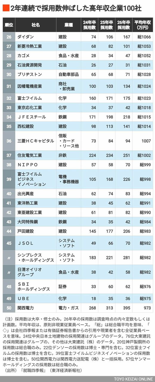 キャリア・教育 #就職四季報プラスワン 前の記事 次の記事 2年連続で「採用数が拡大」した"年収の高い企業"TOP100社 1位は20人増やした平均年収1486万円の"専門商社" 2分で読める 公開日時:2026/04/28 05:00 2年連続で採用数を伸ばした高年収企業100社をランキング形式で紹介。注目の1位は? 丹羽 夏海 東洋経済『就職四季報』編集部 フォロー 1/5 PAGES 2/5 PAGES 3/5 PAGES 26~50位は? 次ページが続きます:【51~75位は?】 4/5 PAGES 5/5 PAGES