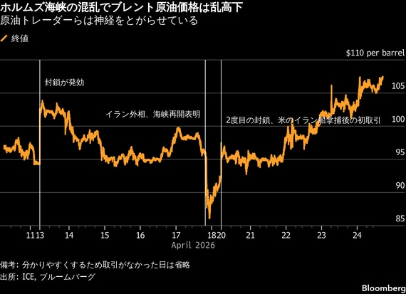 4月前半の暫定的な停戦は西側の船主に安心感を与え、海運大手APモラー・マースクは「通航の機会」を検討していると発表。今月11日にはスーパータンカー3隻が海峡を抜け、戦争開始以降で非イラン産原油の搬出としては最大規模となった。