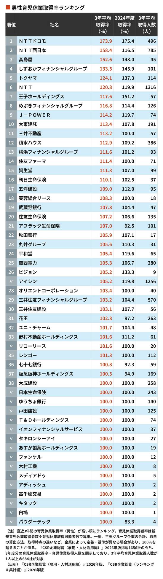 ライフ 「男性社員の育休取得率が高い会社」トップ200 3位が髙島屋で2位はNTT西日本…では1位は? 9分で読める 公開日時:2026/04/29 07:00 「男性社員の育休取得率が高い会社」ランキング(画像:編集部作成) 佐々木 浩生 東洋経済『CSR企業総覧』編集部 フォロー 1/7 PAGES 2/7 PAGES 3/7 PAGES 4/7 PAGES 1〜38位 次ページが続きます:【ランキング表②】 5/7 PAGES 6/7 PAGES 7/7 PAGES