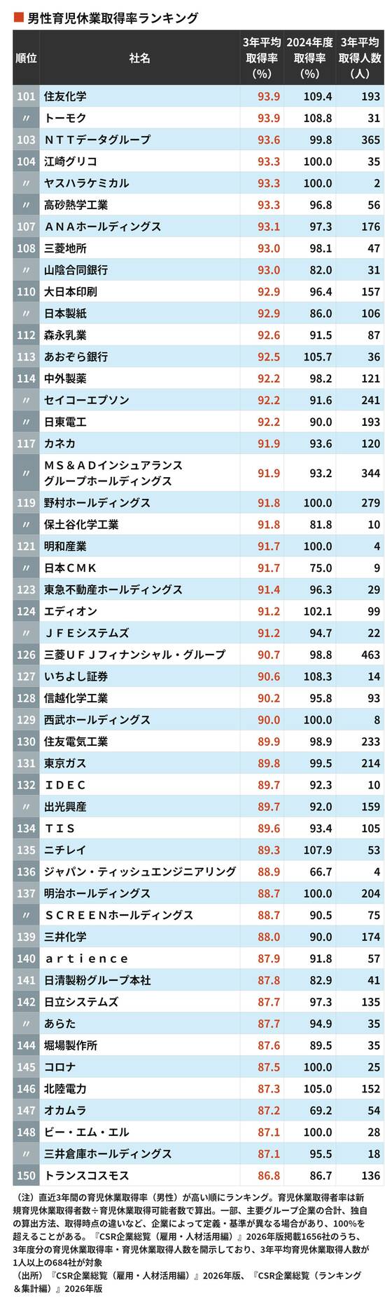 ライフ 「男性社員の育休取得率が高い会社」トップ200 3位が髙島屋で2位はNTT西日本…では1位は? 9分で読める 公開日時:2026/04/29 07:00 「男性社員の育休取得率が高い会社」ランキング(画像:編集部作成) 佐々木 浩生 東洋経済『CSR企業総覧』編集部 フォロー 1/7 PAGES 2/7 PAGES 3/7 PAGES 4/7 PAGES 5/7 PAGES 6/7 PAGES 101〜150位 次ページが続きます:【ランキング表④】 7/7 PAGES