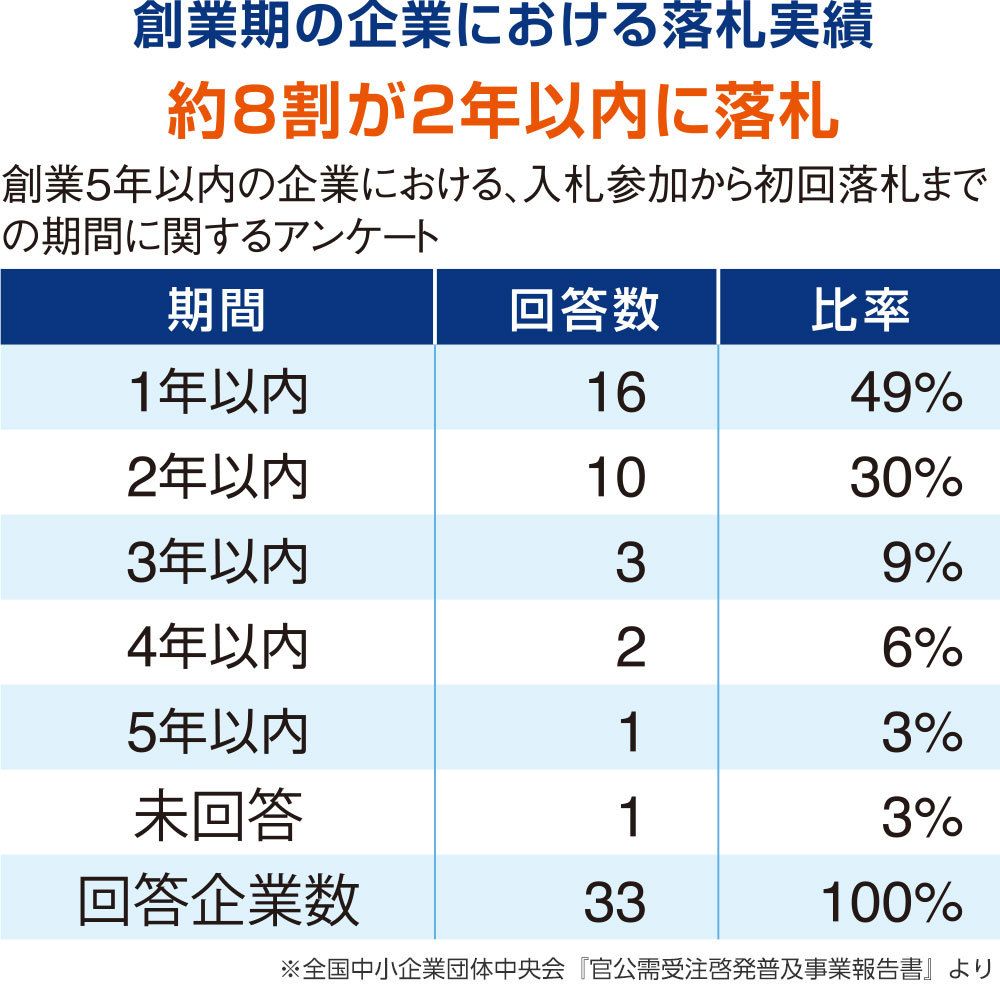 現在、入札には大きく分けて三つの契約方式がある。資格があれば誰もが参加できる「一般競争入札」、特定の条件が必要な「指定競争入札」、任意に契約相手を選定する「随意契約」だ。特に最近は、新規参入の障壁となっていた随意契約が減り自由参加方式の入札案件が増える傾向で、中小企業庁からの指導などによって大きな案件が細かく分割され、中小企業でも参入しやすい土壌が出来上がってきている。このため、創業から間もない企業にもチャンスが広がっており、業務実績の少ない企業でも2年以内に8割の企業が成果を出しているという調査結果もあるほどだ(全国中小企業団体中央会『官公需受注啓発普及事業報告書』)。