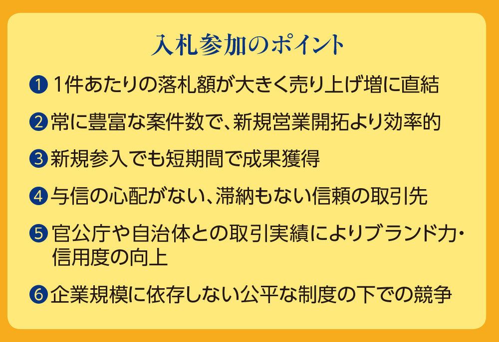 国や自治体などと取引関係が築けたことで業績アップはもちろん、会社としての信用度も大きく向上することは言うまでもない。NJSSの調査によれば、新規参入企業の平均落札額は780万円となっており、ビジネスとしてもかなり大きなものとなっているのだ。もちろん、発注元は公的な機関なので、代金回収リスクがないのは言うまでもない。