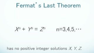 そんなつながりを示すうえで重要な役割を演じたのが、かの有名な「フェルマーの最終定理」だ。その「定理」は、一見するとピタゴラスの定理を素直に拡張しただけのようのようにみえる。ところが、なんのことはなさそうなその問題が、実に350年以上ものあいだ、未証明のままにとどまったのである。