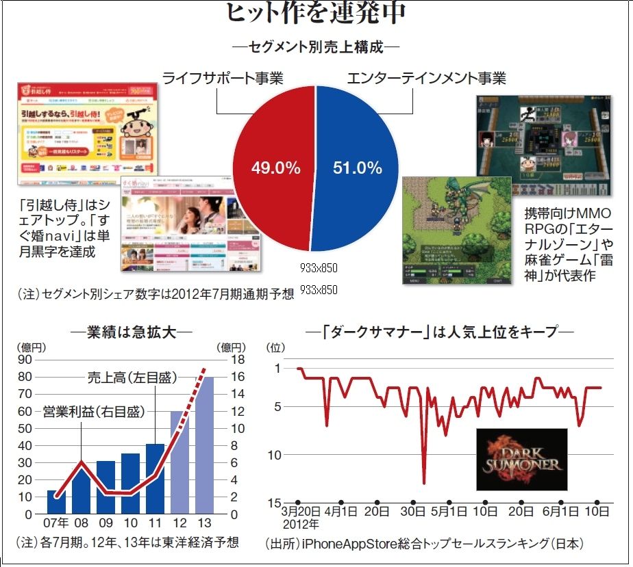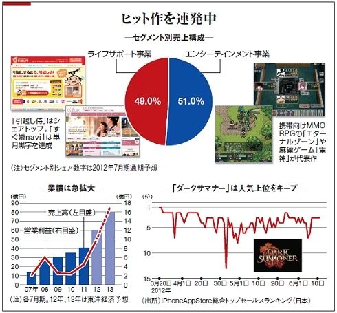 公式サイトから始まったエンタメ事業でも、少数のヒット作に頼らない体制作りを怠っていない。公式サイトは300以上も運営。グリーなどプラットフォーム向けソーシャルゲームは100以上、スマホアプリは50以上販売する。現在、強化しているスマホアプリでは、「世界市場を視野に入れ、『ダークサマナー』に続く新タイトルの開発を進めている」(中内之公取締役エンターテインメント事業本部長)。