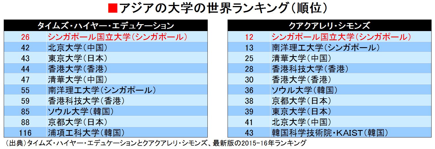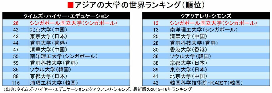 世界の大学ランキングで有名な英教育専門誌タイムズ・ハイヤー・エデュケーションによると、東大は世界で43位。一方でNUSは26位。タイムズと同じく大学ランキングの指標として有名な英国クアクアレリ・シモンズ(QS)でも東大は39位、NUSは12位だ。
