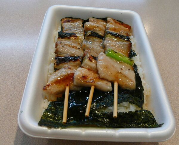 函館ワインを吹きかけて焼いた「焼き豚」。ご飯との相性も抜群のやきとり弁当だ(写真:筆者)