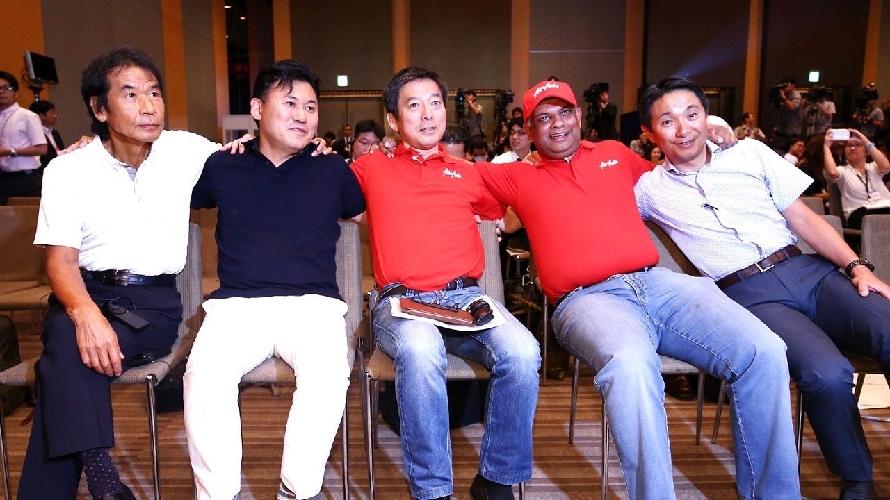 2014年の会社設立会見で肩を組む、フェルナンデス氏(右から2人目)と小田切氏(同3人目、撮影:尾形文繁)