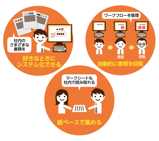 「DocuMaker Office」には書類記載の進捗(しんちょく)を効率よく管理する「ワークフロー機能」がある。そこで同社ではこの機能を用いて従業員が要望提案することのできる業務改善シートをシステム化。これまで紙を手作業でまとめて集計していたものが自動的に集計できるだけでなく、複数の審議担当者に対して自動的に書類を回覧することもできるようになり、効率的に情報共有が図れるようになる。また「DocuMaker Office」には文書をシステム化するだけでなく、紙の書類運用を効率化する機能を兼ね備えており、その一例がPCやスマートフォンなどのデバイスが利用し辛い現場におけるマークシートでのデータ収集だ。マークシートの用紙作成からスキャン、データ取込、集計まで全てを自社内にて行なうことができ、同社でもこれまでマークシートを配布して実施していた業務内容に関する理解度チェックに「DocuMaker Office」を活用。マークシートを配布したり回収したりして集計する手間を削減していく方針だ。