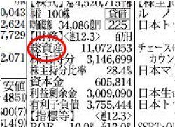 まず「総資産」です。これは【財務】欄に示されています。単位は100万円なので、下2ケタの数字は切り捨てると、億円単位で考えることができます。5ケタ以上だと兆円単位というワケですね。<11.12>とあるのは、2011年12月末時点の数字であることを示しています。