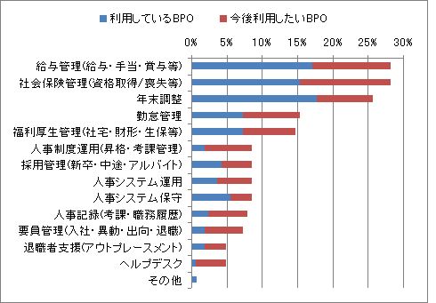 今回の調査では「今後利用したいBPOサービス」も合わせて質問している。「現在利用しているBPOサービス」と合算したグラフを紹介する。10%以上の項目は、「給与管理(給与・手当・賞与・税金・振込)」28%、「社会保険管理(資格取得/喪失・給付・納付等)」28%、「年末調整」26%、「勤怠管理」15%、「福利厚生管理(社宅/寮・財形・生保・慶弔・融資)」15%だ。これらの業務は定型的で外部にアウトソーシングしやすいということだろう。