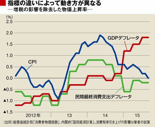 2014年春に行われた消費税率の引き上げの影響を除去してみると、消費者物価指数(CPI)とGDPデフレータの動きの対比はより鮮明だ。