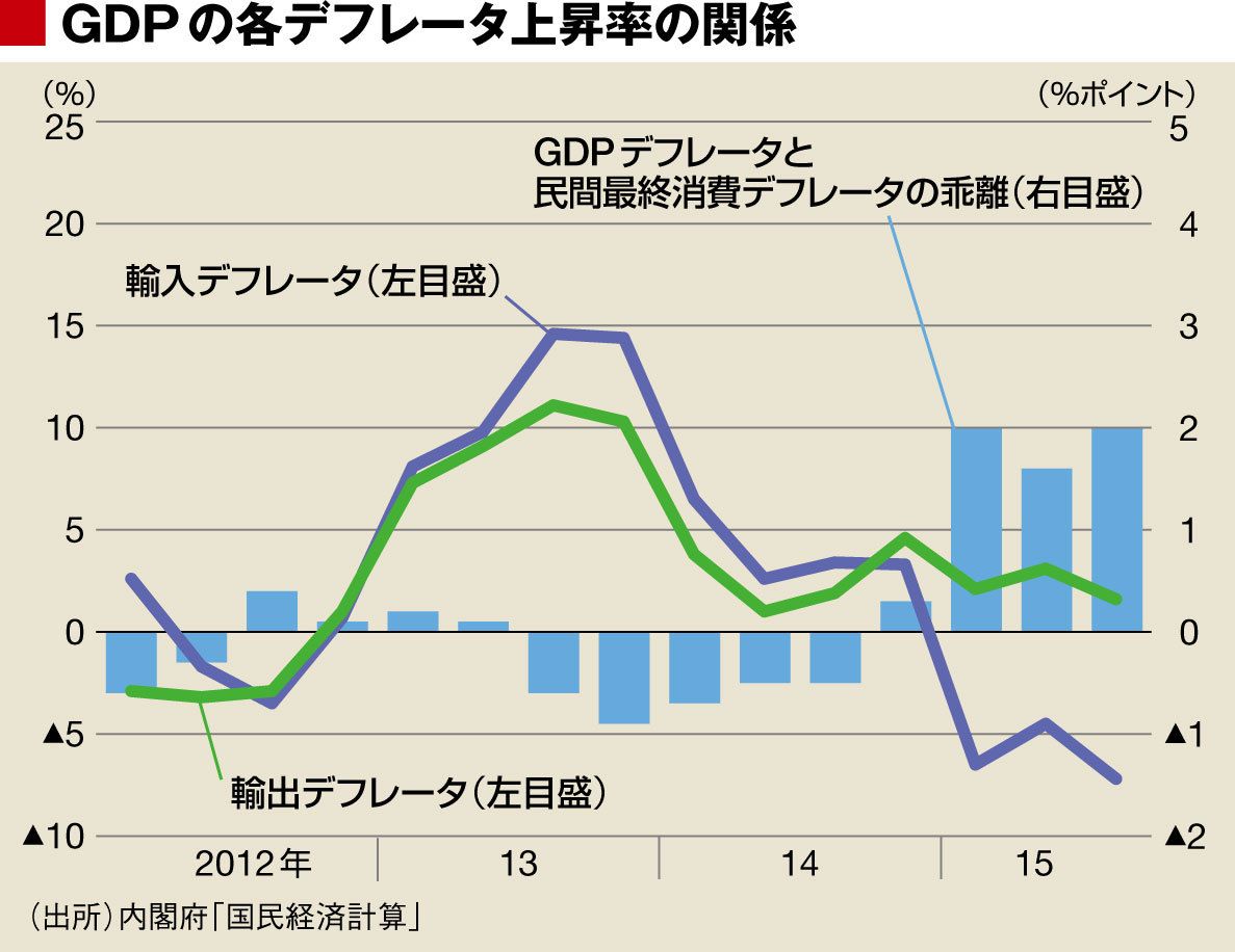 2012年末に第2次安倍政権が生まれてから円安が大幅に進んだ。2013年の前半は輸出、輸入デフレータは、ともに大きく上昇しているが、ほぼ同じ程度だった。2013年後半からは、輸入デフレータの上昇率が輸出デフレータよりも高くなった。そして2014年末以降は輸入物価が大きく落ち込み、輸出と輸入のデフレータの動きは2013年秋ごろとは逆方向に大きく乖離した。