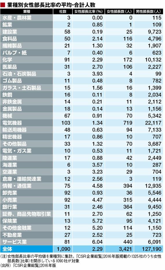 業種ごとの対象社数、女性部長比率の平均値、男女別の合計部長数を集計した。全社の合計人数は男性部長数12万7190人に対して女性部長数は3421人。前年の2627人からは増えているが男性に比べて圧倒的に少ない。