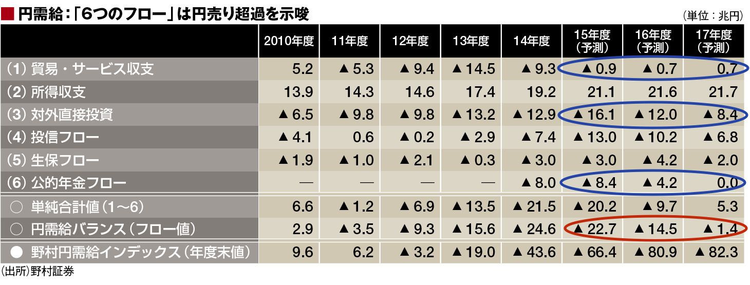 2015年には生損保の大型M&Aが続々と発表されたが、直接投資による資本流出は年間約15兆円というペースに膨らんでいる。さらに、為替ヘッジなしの外国証券投資が約20兆円あり、このうち約8兆円が相場に影響されにくい年金マネーの外貨シフトである。筆者は、2015年度、2016年度の円需給をそれぞれ23兆円、15兆円の円売り超過と見積もっている。