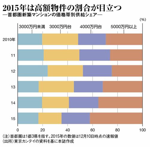 東京カンテイによると、首都圏で供給された新築マンションのうち、2010年には3割に満たなかった5000万円以上の物件が、2015年は4割を超えた。