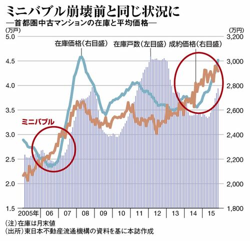一方、「バブル崩壊には至らない」と見るのは、東京カンテイの井出武・上席主任研究員だ。中古価格は天井圏を迎えているので、3~5%程度の調整は必至。ただ、ミニバブル後のような“崩落”ではなく、マイルドな“調整”で終わるという。消費増税前の「経過措置」が16年9月から始まり、駆け込み需要が発生すると考えられるからだ。