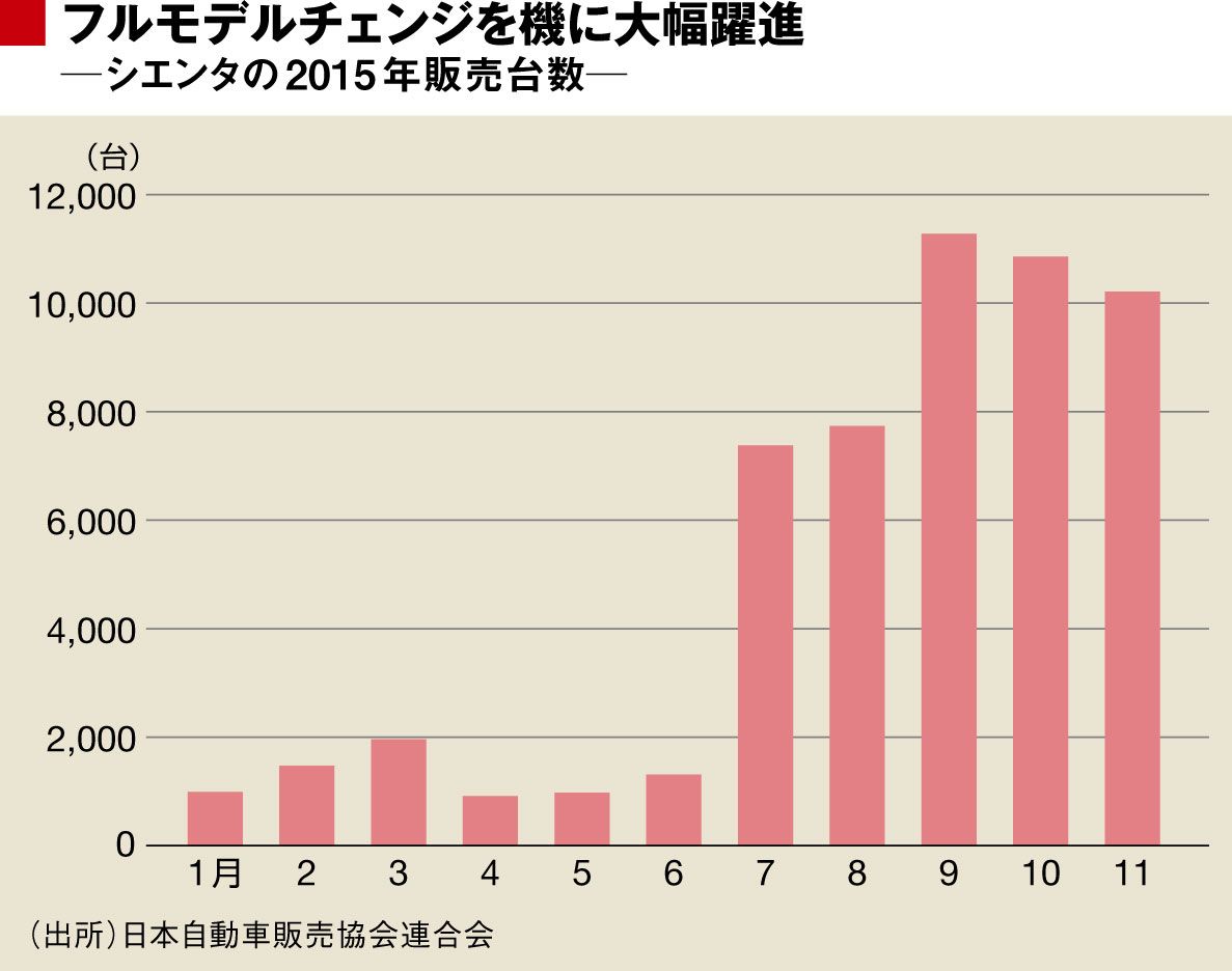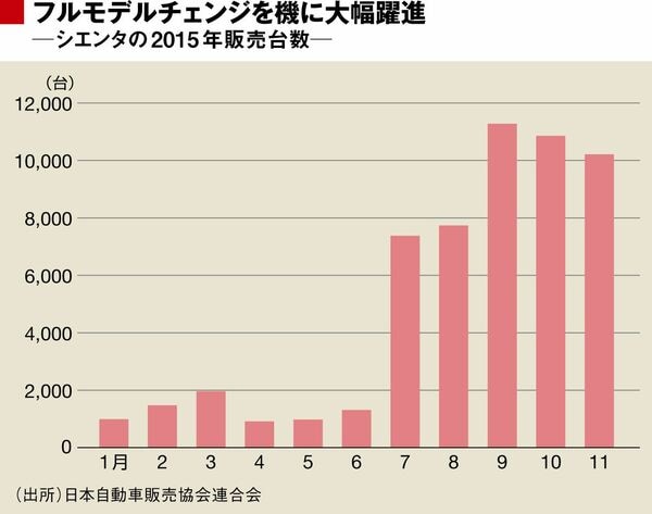 日本自動車販売協会連合会(自販連)によれば、シエンタは初代のモデル末期だった2015年1~6月の月間平均販売が約1200台に過ぎなかったが、2代目へ切り替わった同7~11月は同約9500台と8倍近くに膨れ上がり、当初設定した月販目標7000台を軽くクリア。2代目の販売が本格化してきた同8月以降は、軽自動車を除く普通乗用車の車名別新車販売ランキングにおいて、トヨタの最量販車種でコンパクトハイブリッドカー(HV)の「アクア」に次ぐ2位に食い込み続けるなど絶好調だ。