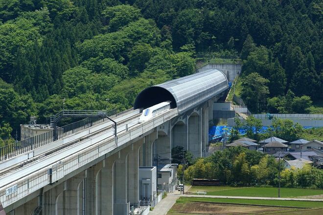 実験線のトンネルを抜けて疾走するリニア。品川〜名古屋間はトンネル区間がほとんどを占める(撮影:尾形文繋)