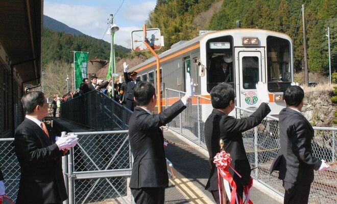 工事は2013年5月にスタートし、今年2月に完了。その後の乗務員の訓練運転を経て運転再開にこぎつけた。「被災から6年5カ月かかっての再開。この長さは日本記録」と、前葉泰幸・津市長は言う。確かに東日本大震災による被災で、駅舎や橋が流された三陸鉄道ですら、3年で全線復旧にこぎつけた。その2倍を超える長い年月、名松線の沿線住民は応援を続けていた。