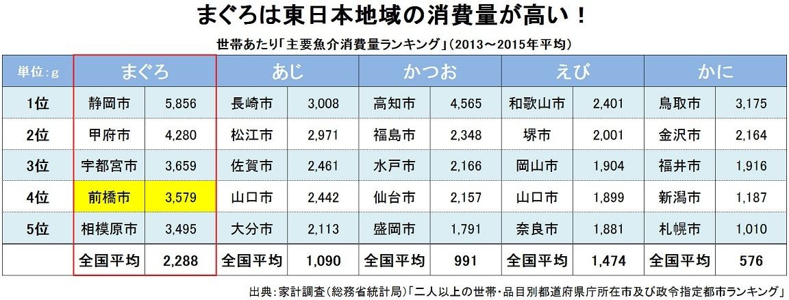 マグロが好きな地域性も背景にあるようだ。草津温泉や伊香保温泉など名湯の多い群馬県の旅館女将から「群馬県人はマグロが大好き」と聞いたことがある。家計調査(総務省統計局)によると、マグロの消費量が多い県庁所在地・政令指定都市では、前橋市(群馬県)が堂々の4位にランクインしており、「群馬県民はマグロ好き」は統計上からも言える。