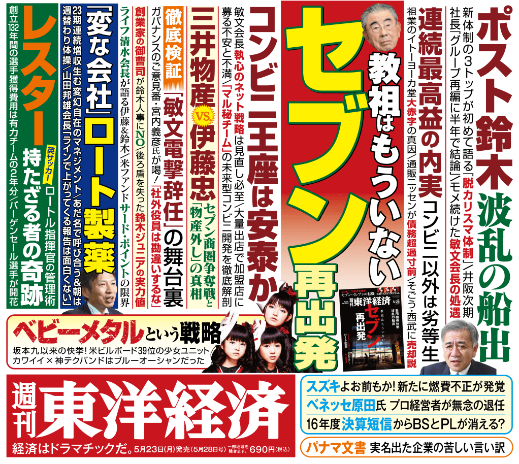 週刊東洋経済は5月28日号(23日発売)で『セブン再出発』を特集。「教祖」がいなくなったセブン&アイを新経営陣がどう運営しようとしているのか、当事者の肉声を交えて徹底的にリポートしている。