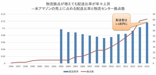 アマゾンにとって、配送費の増加は悩みの種となっている。2015年度の売上高に占める配送費比率は11.6%で約1.3兆円だった。日本の宅配最大手のヤマト運輸のデリバリー事業が1.1兆円であることを考えれば、その規模の大きさがわかるはずだ。ヤマト運輸の宅急便など配達に関わる売り上げを超える配送料をアマゾン1社で支払っているのだ。