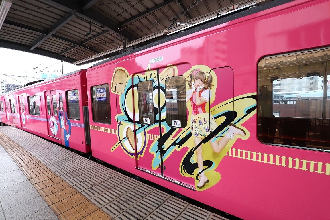 目指したのは「沿線に刺激を与える、動く観光名所」(中山さん)。外観だけでなくドアなど内部も装飾したのは「『動くきゃりーさんの家』のようなイメージを出したかったから」という。ひときわ目立つショッキングピンクのカラーリングはラッピングではなく塗装で、その上に楽曲をイメージしたデザインなどをラッピングしている。「KPP TRAIN」の運転期間は6月4日から9月29日までの約3カ月間。一般的に短期間のイベント車両は塗装ではなく全体をラッピングとすることが多いが「(手間のかかる)塗るという本気度は分かる人には分かるし、説得力がある」と塗装にした。