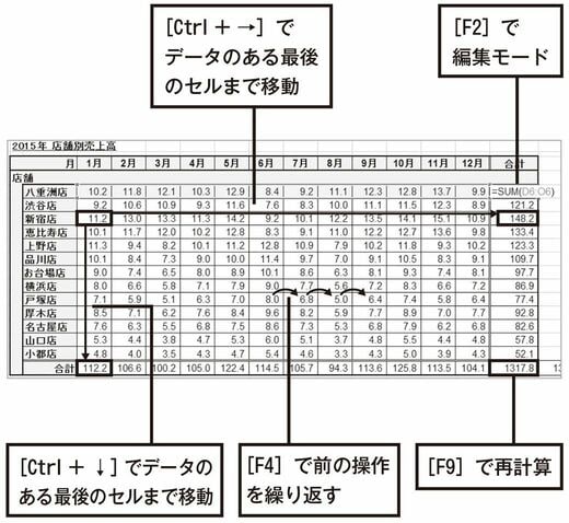 マウスでダブルクリックすると、セルが編集モードになりますが、[F2]を押すことでも編集モードになります。また、数式が入力されているセルで[F2]を押すと、その数式が参照しているセルを色枠で表示するので、数式が正しいかを確認するときに便利です。