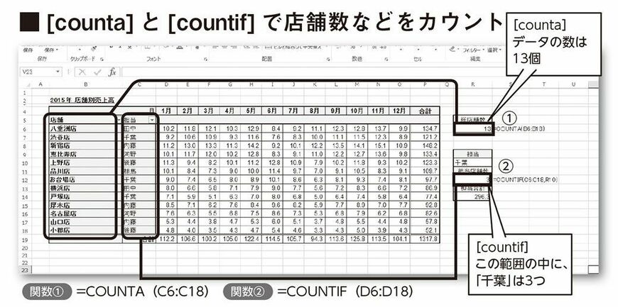 [countif]は条件式でカウントします。1000個のデータの中に「山」「川」といった文字のデータが何個あるかをカウントできます。慣れてきたら[countifs]という複数の条件を指定できるものも使ってみてください。