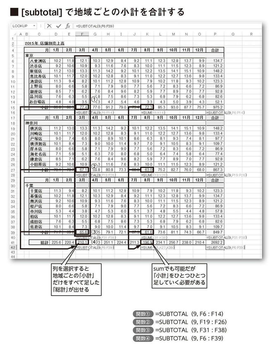 いくつかのかたまりごとの小計を計算し、それらの合計を出すときに便利な関数です。[subtotal(9,範囲)]で範囲指定をして使います。