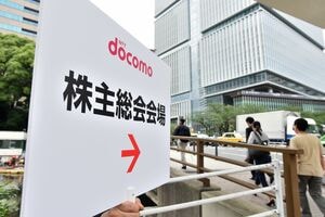 携帯最大手のNTTドコモは6月16日、千代田区のホテルニューオータニで株主総会を開催した。所要時間は2時間5分(昨年は2時間8分)。会場に訪れた株主は3496人(同4077人)で、2年連続で減少した。剰余金の処分(配当70円)、取締役15人選任、監査役1人選任の全3議案はすべて拍手を持って過半数の賛成を得たと判断し承認された。