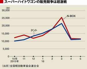 メーカー別の販売台数を見ると、2015年度はダイハツが58万台とトップなのに、32万台のホンダに車名別で後塵を拝している状況だ。販売ネットワークが強大なダイハツやスズキに対して、ホンダは車種を絞り込んでブランド価値を高める戦略を採っているように見える。
