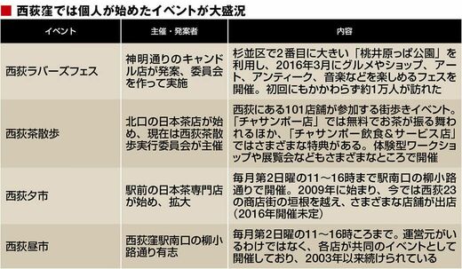 「地元を盛り上げたい」「面白いことが好き」「採算は気にしない」――。この3つの要素を備えたイベントにはこのほかにもたくさんある(下表)。いずれも、個人や個店が始めて、街全体に広がったものだ。日本には同じ町内にありながらいがみ合う商店街が多いにもかかわらず、西荻窪は23ある商店街が連携するイベントが多いのもこの街らしい。