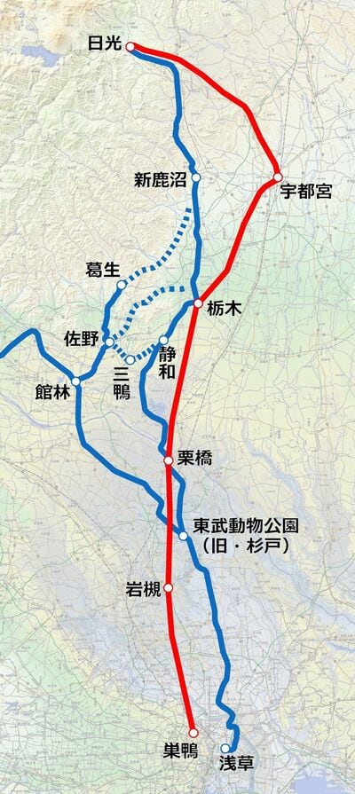 東武鉄道の伊勢崎線・日光線・佐野線(青実線)と東京日光電鉄(赤)のルート。東武は当初、佐野線の活用による日光進出(青点線)を考えていた。(地図ソフト「カシミール3D 地理院地図+スーパー地形セット」で作成)