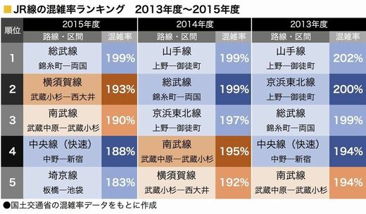 国土交通省が毎年発表する電車の混雑率。上位に顔を出す路線名は例年あまり変わらなかったが、2015年度は「上野東京ライン」の開業で、これまで長らくJR線の混雑率トップ3にランクインしていた山手線と京浜東北線の上野~御徒町間が5位以下となり、顔ぶれに変化が生じた。