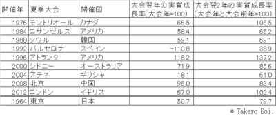 1976年のモントリオール大会以降、開催国の実質経済成長率を、オリンピック開催年を100とした翌年の成長率の大きさで指数化した(日本のみ、旧基準の内閣府「国民経済計算年報」に基づく値)。この値が100を超えていると、開催翌年の成長率は開催年よりも高くなったこと意味する。100を割っていると、開催翌年の成長率は低下したことを意味する。マイナスの値は、開催翌年の成長率はマイナスとなったことを意味する。
