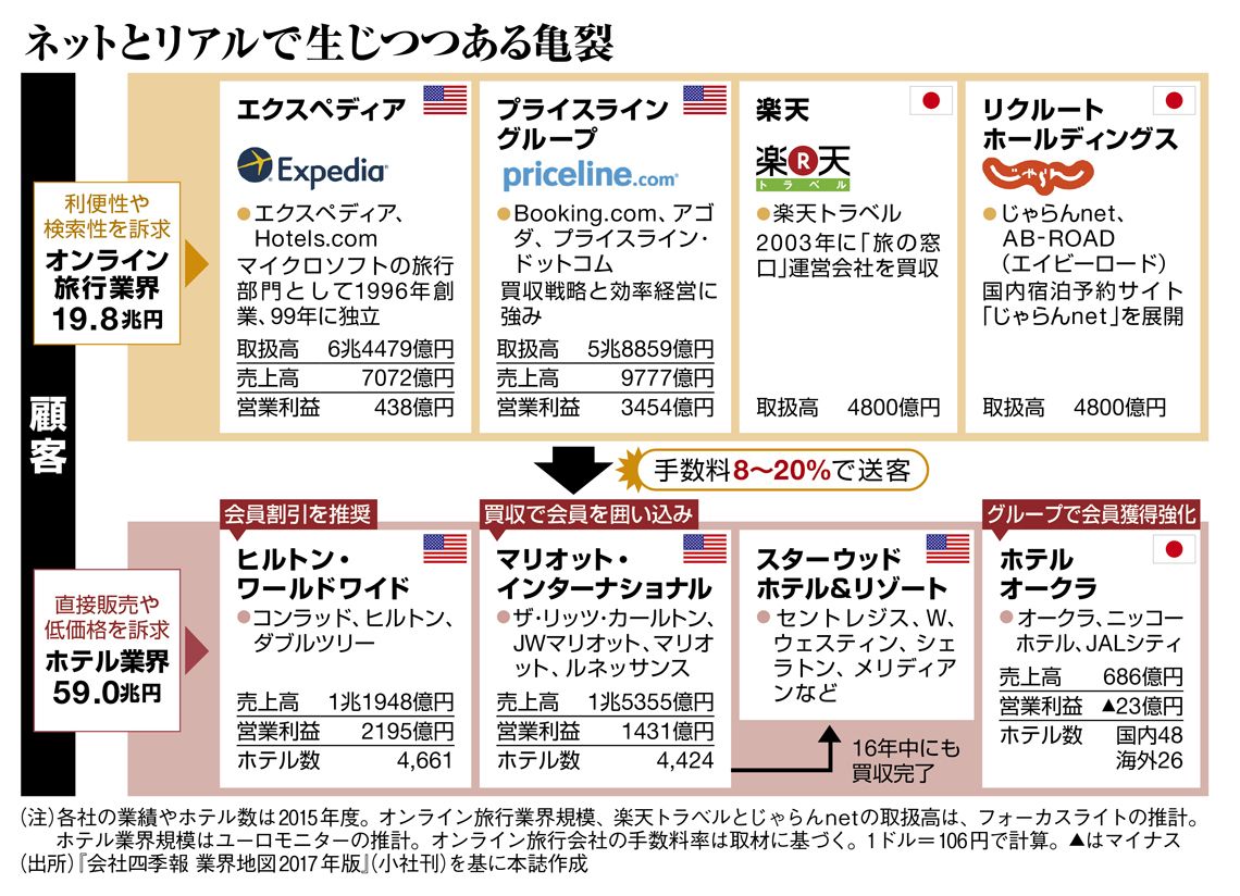 現在でもオンライン旅行会社は、ホテル側にとって、ネット経由で送客してくれる、ビジネス上のパートナー。だがその存在は、今や大きくなりすぎた。ホテル業界から聞こえるのは、「手数料が高すぎる」(中堅ホテル運営会社トップ)という反発。各サイトの手数料率は非開示ながら、海外で15~20%、国内大手では8~10%とされる。