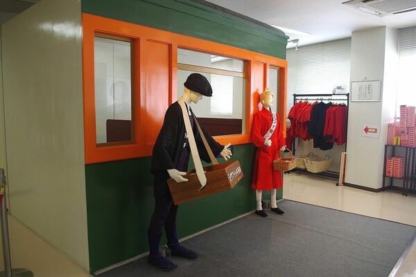まずは5階のホールへと案内される。エレベーターから降りると、今度は目の前に湘南色の80系車両が! 昭和30年代の横浜駅ホームでの駅弁の立ち売りと、シウマイ娘を模した人形が立っている。立ち売りとは、列車が駅のホームに停車している間にお弁当やお茶を窓越しに売りに来る人のことである。