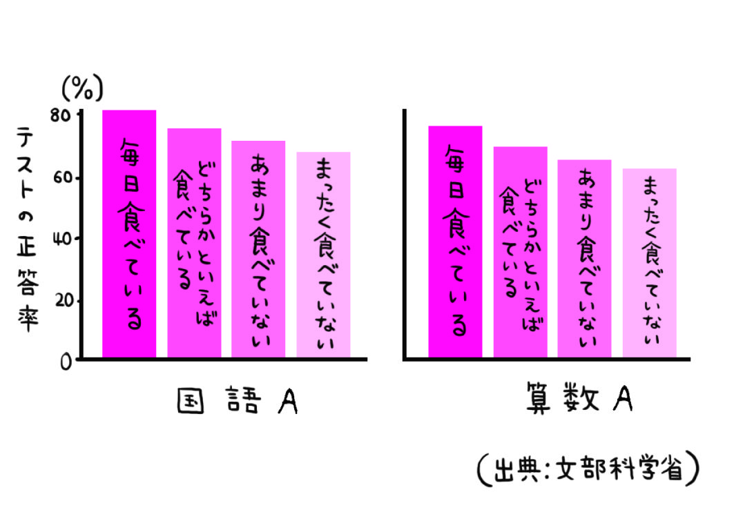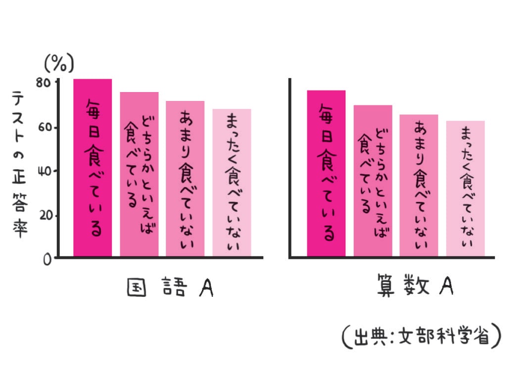 文部科学省が行った調査でも、朝食を食べているかいないかで、成績に違いが出ていることが示されています。また、イギリスのカーディフ大学をはじめ、数々の研究機関で、「朝食を毎朝必ず食べる子どもは、朝食を抜いている子どもに比べて、学力が高い」ということが明らかになっています。