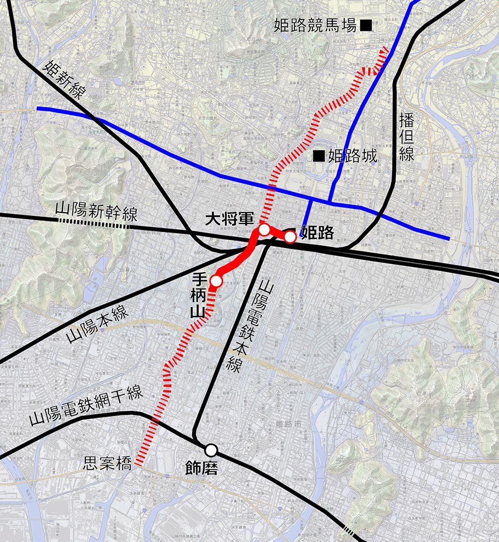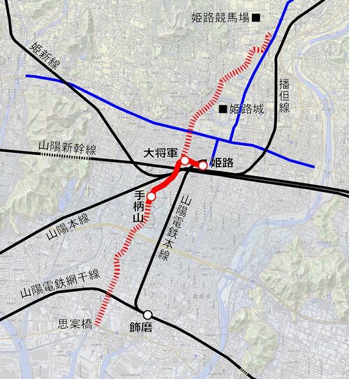 姫路では戦後トロリーバス(青)を運行する計画が立てられたが、すぐに中止。これに代わって計画されたのが姫路駅を中心に市内の南北を縦断するモノレール(赤)だった(地図ソフト「カシミール3D 地理院地図+スーパー地形セット」で作成)