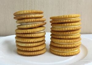 ロゴ部分にモンデリーズ社製は登録商標マークがなく、添え書きもヤマザキ製は「Cream Sandwich Cookies」、モンデリーズ社製は「Milk’s Favorite Cookie」と微妙に違う。ただ、内容量の表示はどちらも9枚×2パック。中味を開封してみると、こちらは形状も完璧。ヤマザキ製とは見た目も味もまったく同じである。
