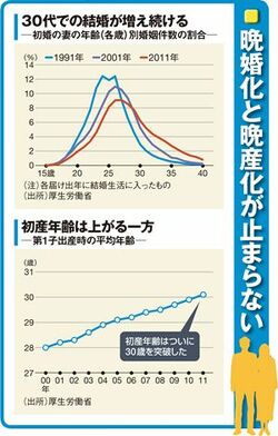 どの国でも、不妊症を抱えるカップルが、10~15%の割合で存在するといわれる。ただし日本の場合、“晩婚化”と“晩産化”が不妊を深刻化させている。2011年には、女性の平均初婚年齢が29.0歳まで上昇。新生児の約6割は、30代のママから生まれているのだ。
