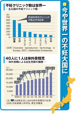 さらに、体外受精、顕微授精などの高度生殖医療(ART)の治療件数でも、日本は年間21・3万件と世界トップとなっている。2009年には、ARTにより2.6万人強の赤ちゃんが生まれた。今や「新生児の40人に1人は体外受精児」という時代が到来しているのだ。