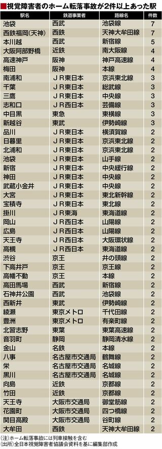 この392件を分析してみたところ、事故がもっとも多く発生しているのは西武鉄道・池袋駅と西日本鉄道・西鉄福岡(天神)駅の各7件だった。次いで西武・本川越駅の5件、近畿日本鉄道・大阪阿部野橋駅、阪神電鉄・梅田駅、高速神戸駅の各4件という結果になった。