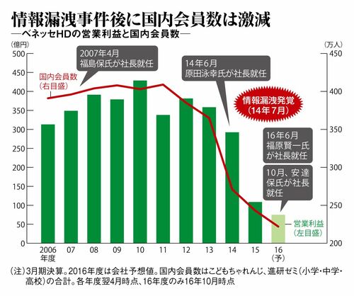 ベネッセの混乱が長引いている。2014年7月、子会社ベネッセコーポレーションで大規模な個人情報漏洩事件が発覚し、会員数が急激に減少。進研ゼミをはじめとする国内教育事業は、営業利益の9割超を稼ぐ主力事業だったため、16年度の営業利益は事件前の8割減の水準まで落ち込む見通しだ。