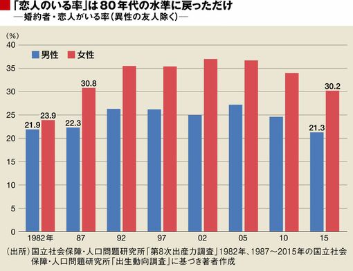 これによれば、1982年から2015年にかけて「異性の恋人(婚約者含む)がいる」という男性は、