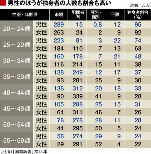 もう1つ注目してほしいのが2015年の国勢調査。これも20~59歳の男女を対象に5歳刻みで「未婚」「配偶者有」「死別・離別」の割合を見ていくと、どの年代においても男性のほうが独身者の人数(未婚+死別・離別)も割合も、圧倒的に高いことが分かります。