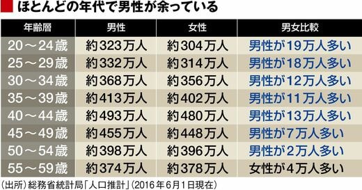 20~59歳を5歳刻みで見ていくと、55~59歳で女性が4万人多い以外は、どの年代も男性が2万~19万人多いため、一夫一婦制の日本では必然的に余ってしまうのです。さらに注目すべきは、50代半ば以降は逆転して女性のほうが多くなること。これは疾病などで男性のほうが早く亡くなるからであり、もしあなたが「『一生に一度は結婚したい』と思っているのなら急いだほうがいい」でしょう。