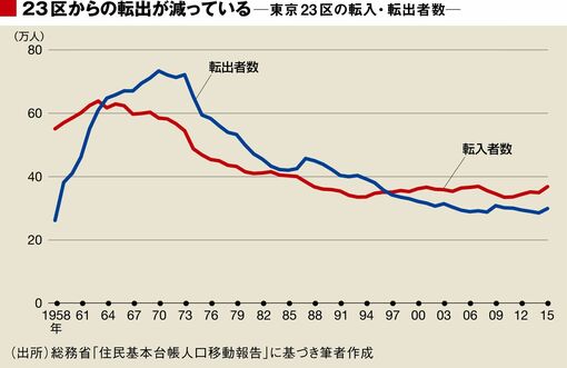 だが、東京都の人口動態を詳しく見ると、転入人口はさほど増えていない。それなのになぜ人口が増えたかというと、転出人口が減ったからである。転出人口が減った理由は、結婚、出産を機に郊外に家を買わなくても、都心で大量供給されたマンションなどを買うことが容易になったからである。