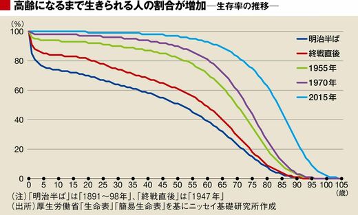 例えば、明治時代に男性で90歳まで生きる人は、生まれた赤ん坊の1%にも満たなかったが、1970年には3.5%になり、2015年には4分の1を超えるまでになった。将来推計人口の想定している平均寿命が実現すれば、2060年には半分ぐらいの人が90歳時点で生き残っているだろう。